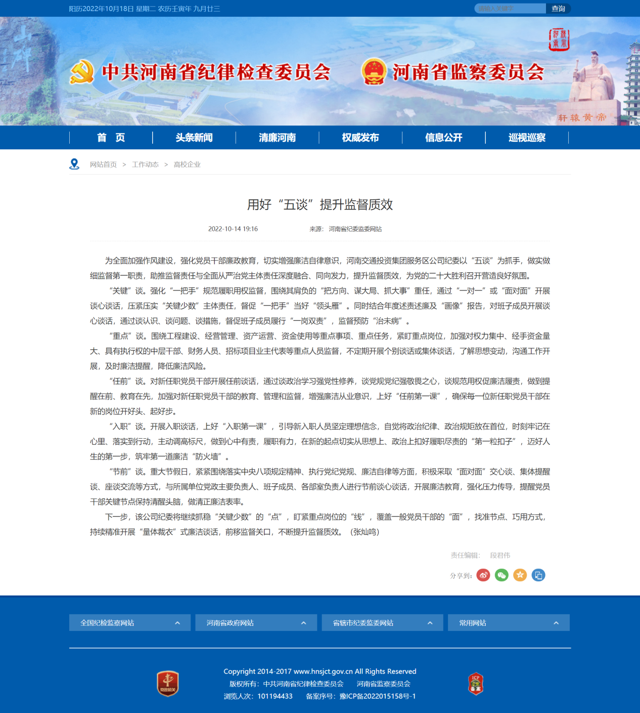 省紀委監委網站刊載公司《用好“五談”提升監督質效》工作信息
