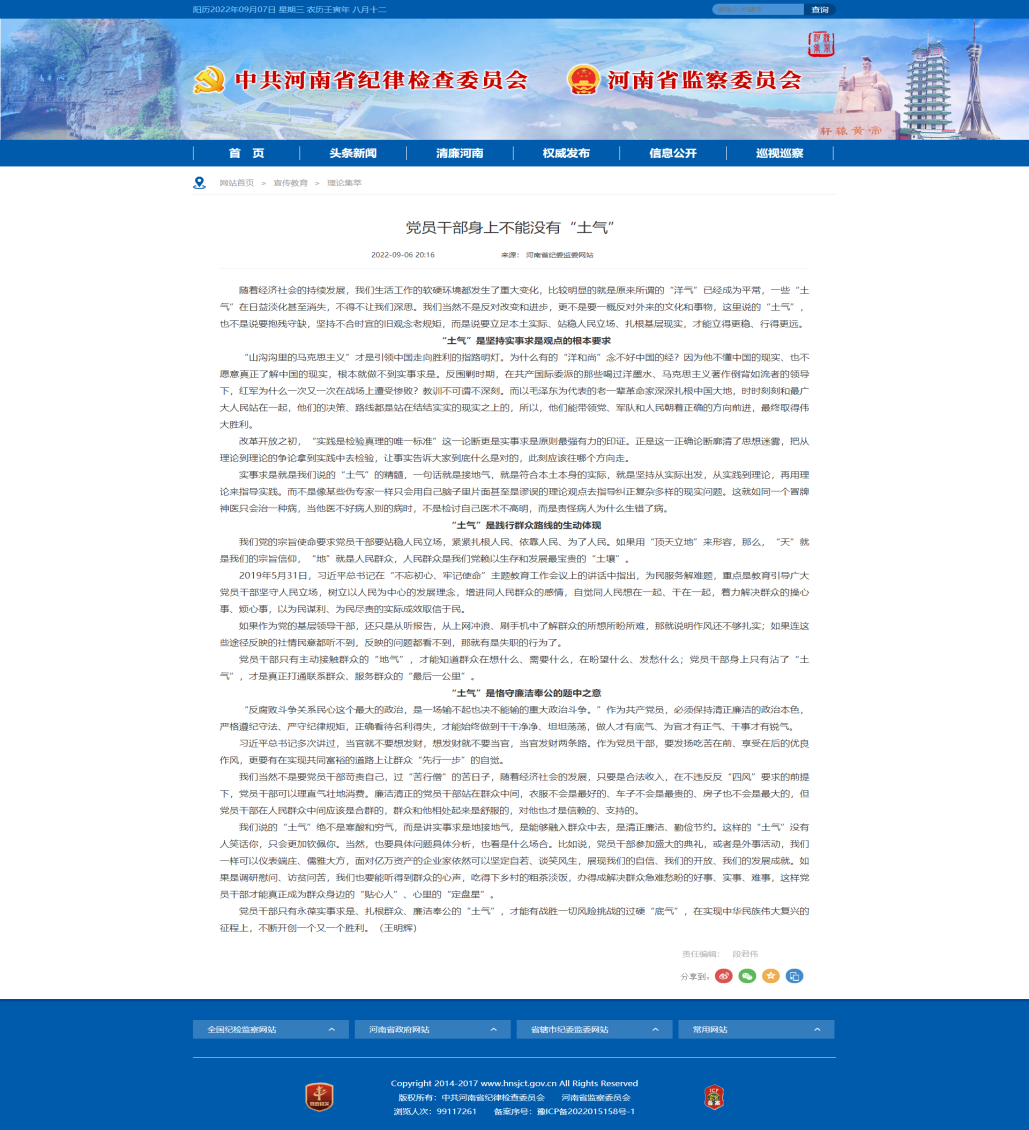 來源: 本站 發布時間: 2022-09-079月6日,河南省紀委監委網站宣傳教育板塊理論集萃專欄刊載公司《黨員干部身上不能沒有“土氣”》工作信息。“土氣”是堅持實事求是觀點的根本要求、是踐行群眾路線的生動體現、是恪守廉潔奉公的題中之意,黨員干部只有永葆實事求是、扎根群眾、廉潔奉公的“土氣”,才能有戰勝…