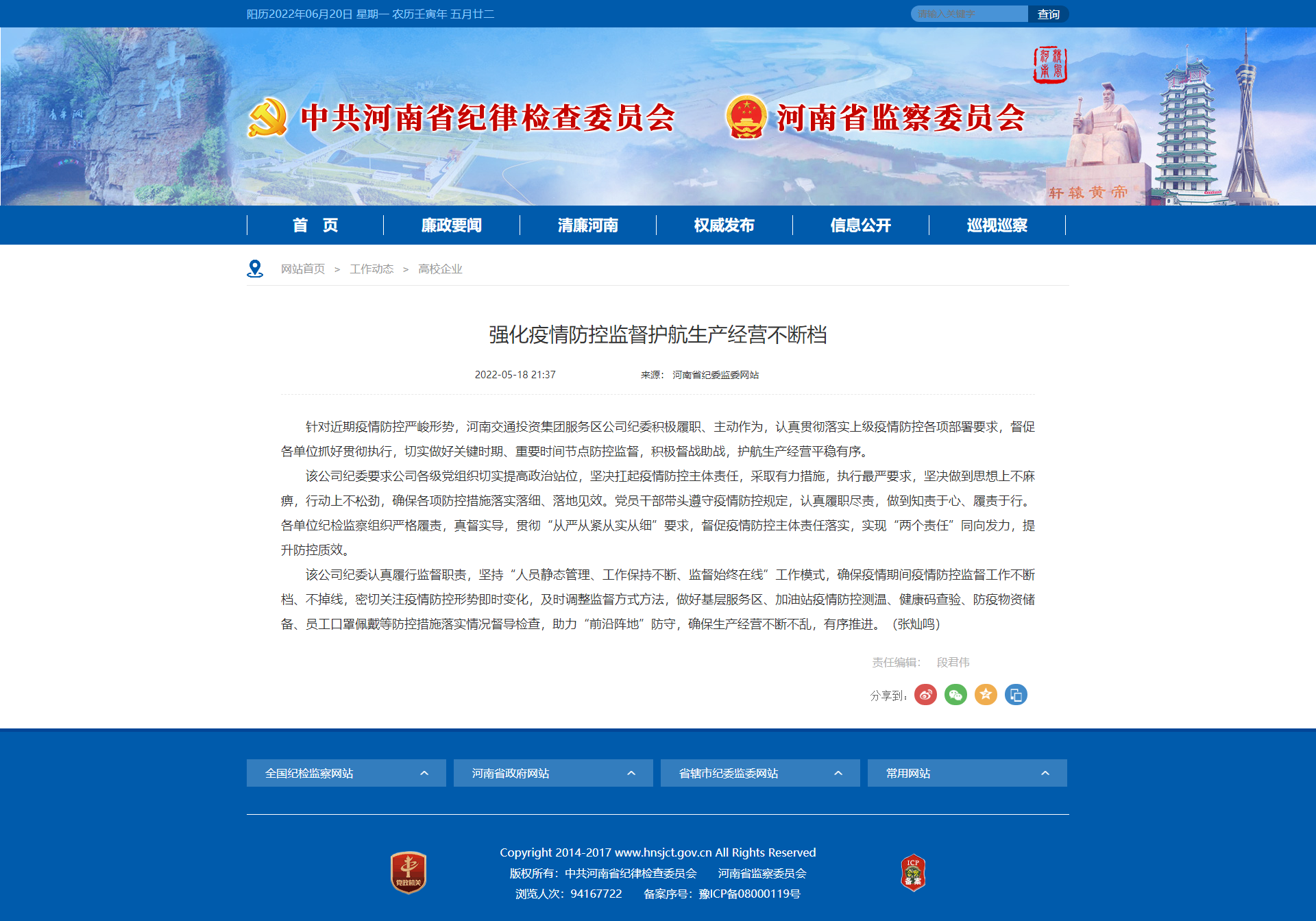 5月18日,公司紀委《強化疫情防控監督護航生產經營不斷檔》工作信息,被河南省紀委監委網站工作動態板塊高校企業專欄刊載。