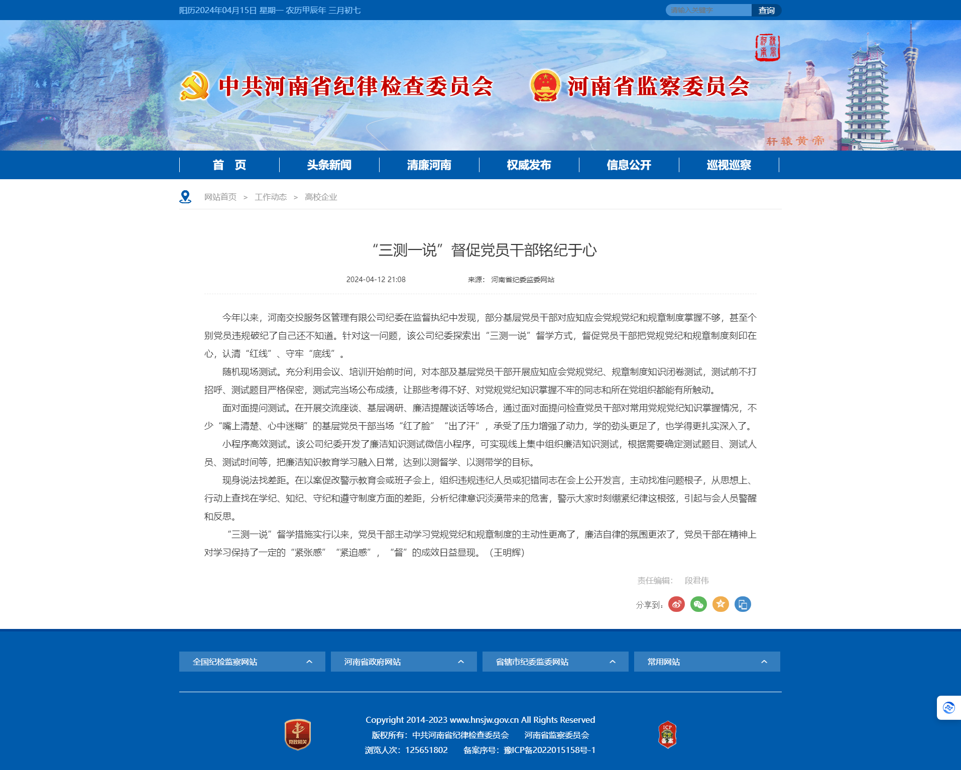來源: 本站 發布時間: 2024-04-154月12日,省紀委監委網站刊載公司紀委加強黨員干部對黨規黨紀和規章制度等應知應會知識學習的有效舉措工作信息《“三測一說”督促黨員干部銘紀于心》。