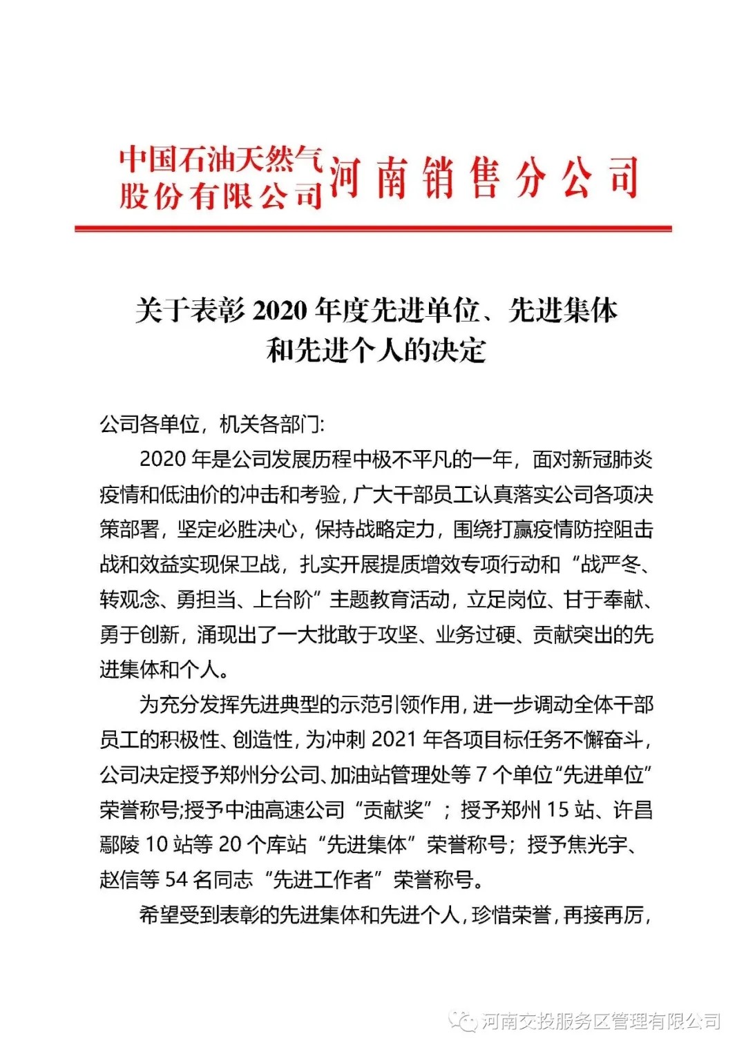 喜訊!中油高速公司獲評中國石油河南分公司2020年度“貢獻獎”