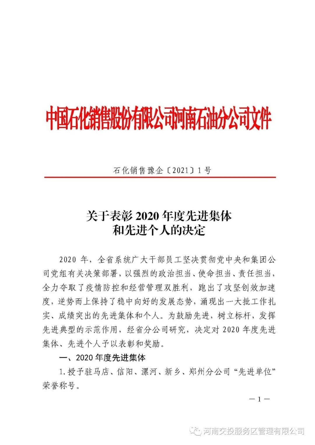 喜訊!高速石化公司獲評中國石化河南石油分公司2020年度“合資企業先進單位”