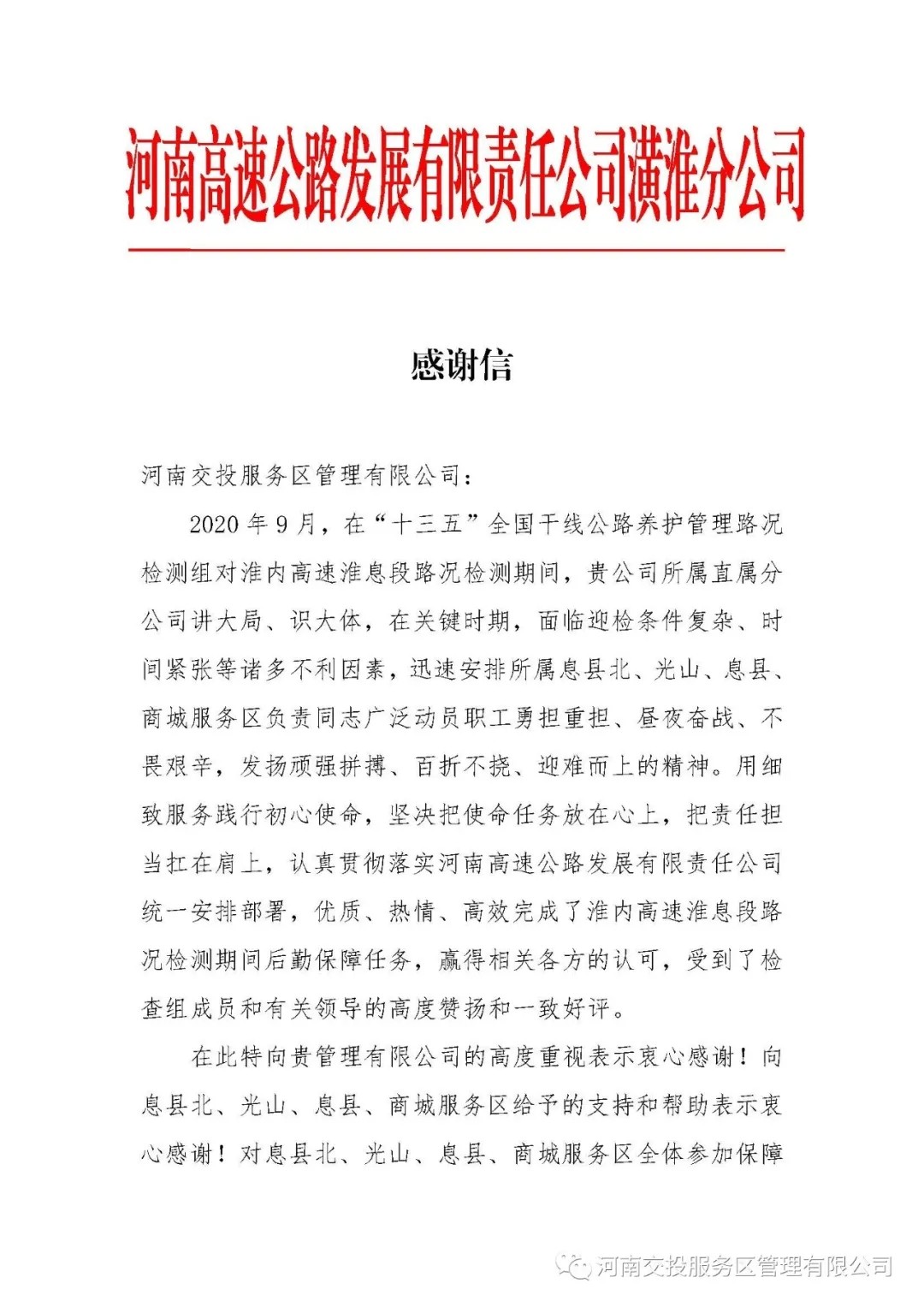 來源: 本站 發布時間: 2020-09-30近日,高發公司潢淮分公司給公司發來《感謝信》,感謝公司所屬直屬分公司在2020 年 9 月“十三五”全國干線公路養護管理路況檢測組對淮內高速淮息段路況檢測期間,講大局、識大體,所屬息縣北、光山、息縣、商城服務區負責同志勇擔重擔、晝夜奮戰、不畏艱辛,優質、熱情、高效…