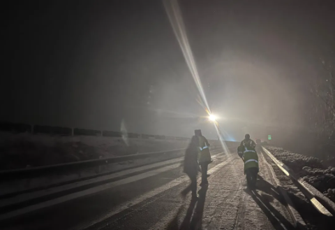 1月21日晚,汝陽服務區持續小雪,為防止夜間路面、地面結冰,對上下道口,快車道及主樓區域進行撒鹽融雪,夜間做好除雪保通工作。牛亞新攝