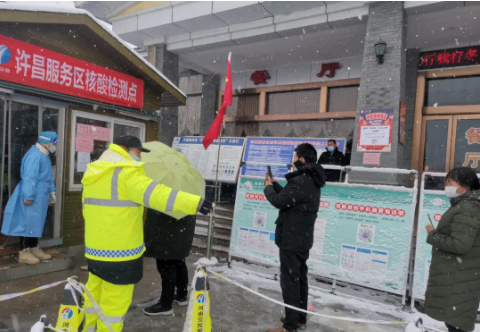 1月23日,許昌服務區雪中堅守崗位,維持核酸檢測點秩序,幫助引導操作核酸檢測點流程 劉雪嶺 攝