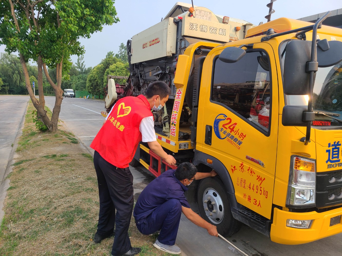 周口東服務(wù)區(qū)汽修人員義務(wù)檢修夏糧收割機(jī)。張?jiān)隼?攝