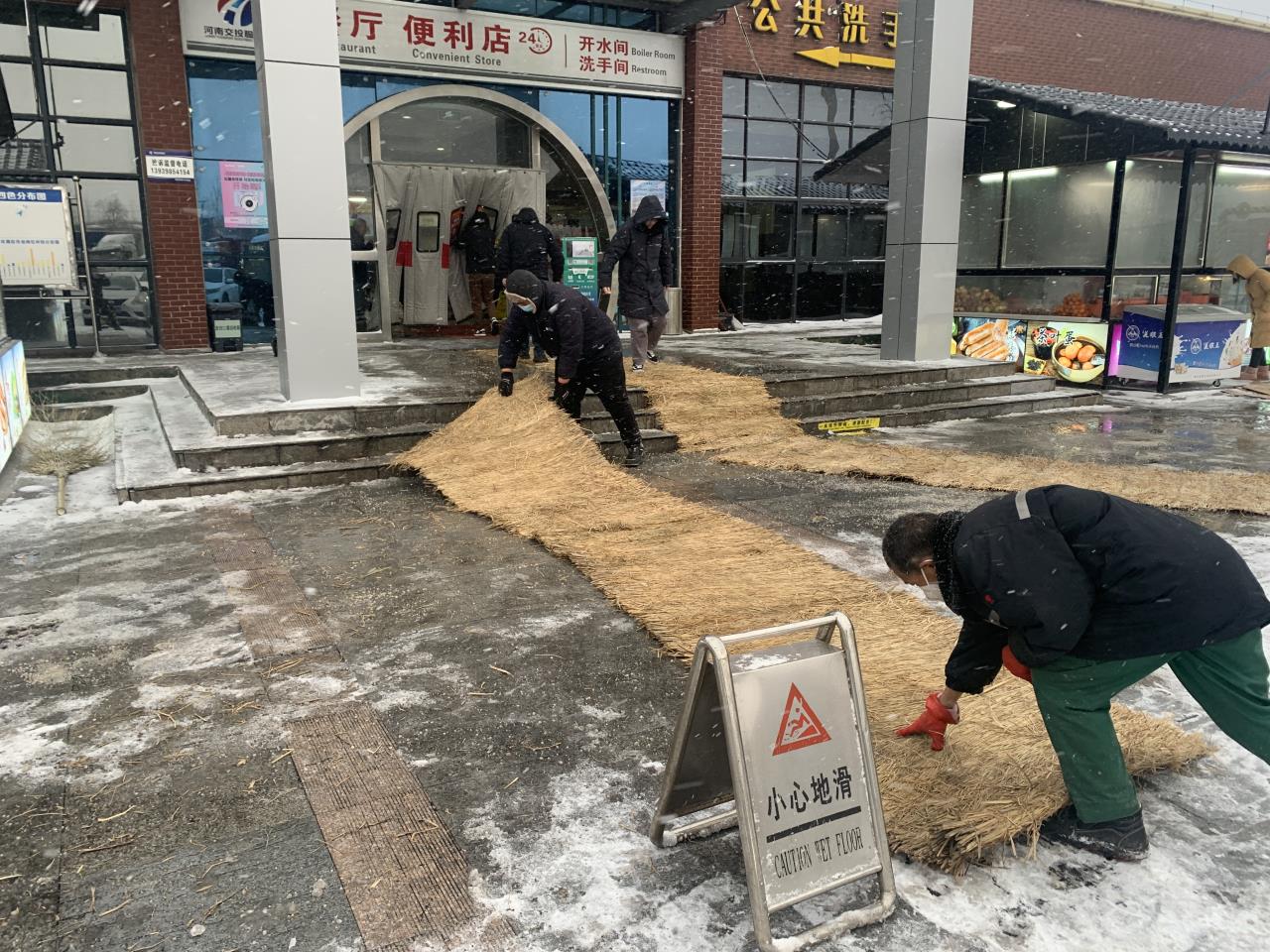 三是浴“雪”奮戰(zhàn)、全力保通。接到氣象預(yù)警提示后,及時(shí)在上下道口、廣場(chǎng)及加油通道等區(qū)域拋撒融雪劑,避免道路積雪結(jié)冰,保障車輛和人員進(jìn)出安全;各服務(wù)區(qū)、加油站黨員職工沖鋒在前,帶領(lǐng)廣大職工使用鐵鍬、推雪板、掃帚等除雪工具,對(duì)上下道口、加油車道、配電房、油罐區(qū)等區(qū)域積雪進(jìn)行全面清理,確保道路安全暢通,保障司乘行車安全;及時(shí)清除通道雨棚、充電樁車棚等屋頂積雪,防止因積雪造成棚頂坍塌等意外發(fā)生;在經(jīng)營(yíng)場(chǎng)所臺(tái)階、人行通道,鋪設(shè)防滑墊、草柵等防滑設(shè)施,進(jìn)一步提高地面防滑性能,降低人員摔傷風(fēng)險(xiǎn);提前做好道路封閉、擁堵等應(yīng)急情況下的儲(chǔ)油、油量控制銷售、加油車輛引導(dǎo)等工作。