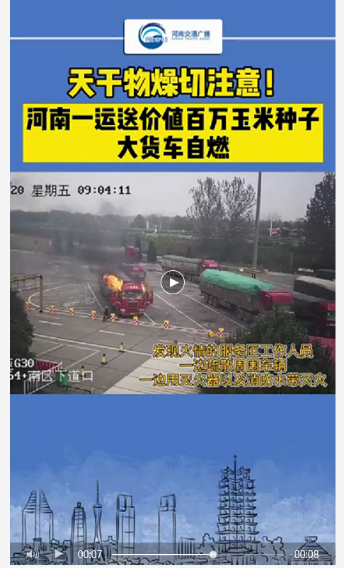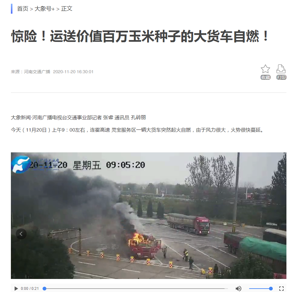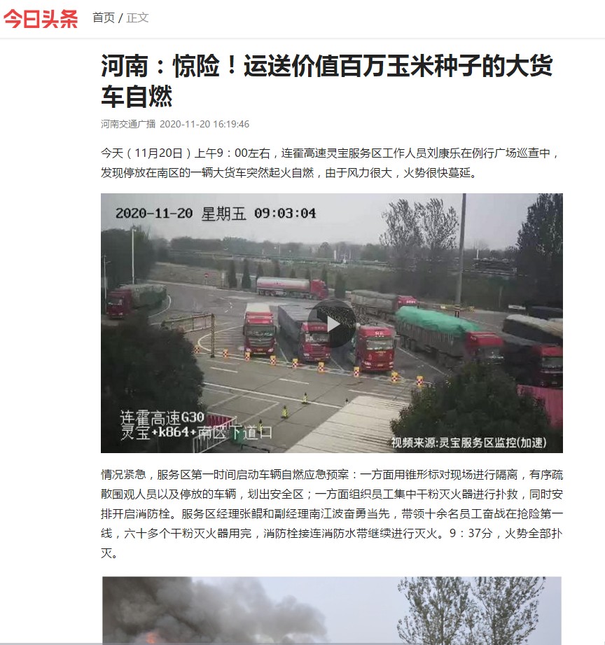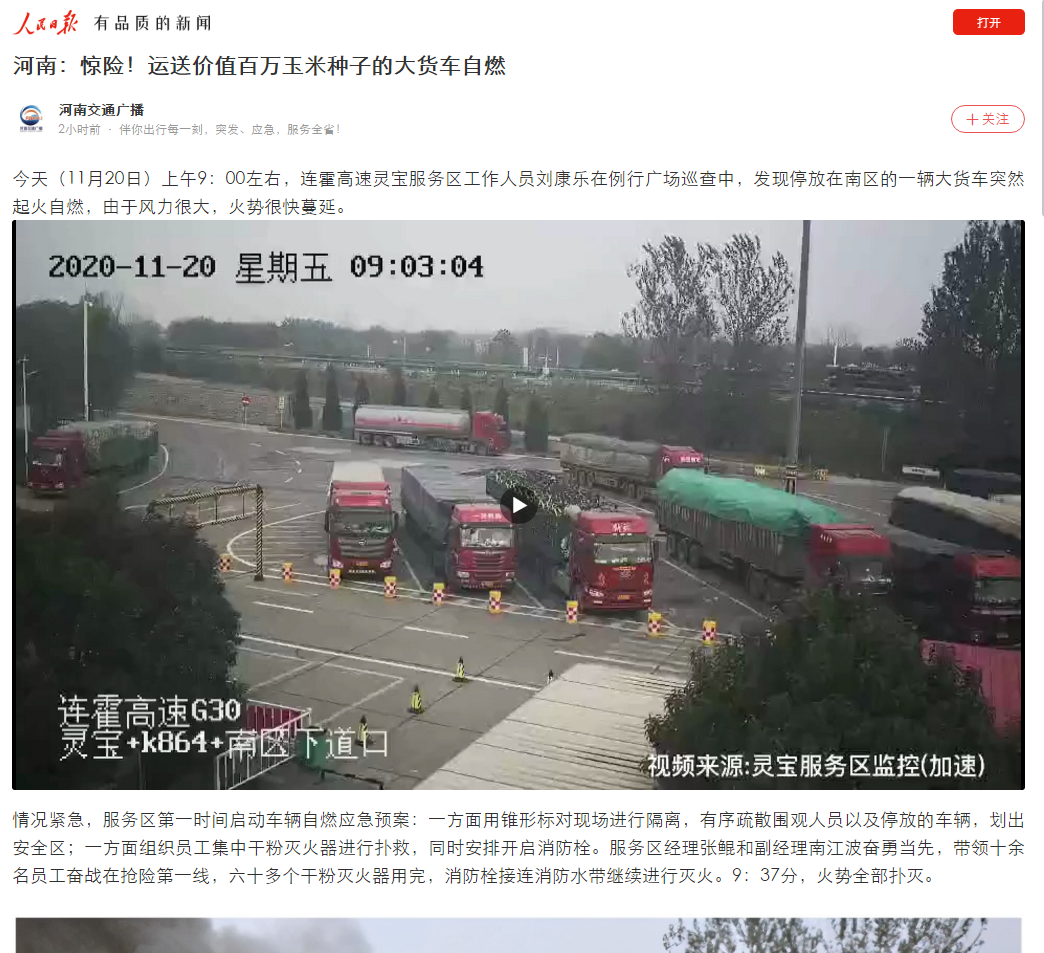 11月20日,人民日報(bào)、河南交通廣播、熱門微博、大象新聞、今日頭條、抖音以題為《驚險(xiǎn)!運(yùn)送價(jià)值百萬玉米種子的大貨車自燃》對靈寶服務(wù)區(qū)妥善處置貨車自燃進(jìn)行了報(bào)道。