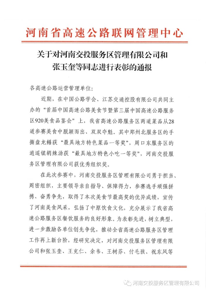 近期,公司參賽團隊在江蘇省沙溪服務區舉行的“首屆中國高速公路美食節暨第三屆高速公路服務區920美食品鑒會上”勇奪“最具地方特色菜品一等獎”、“最具地方特色小吃一等獎”,公司獲評本次活動優秀組織獎!有力宣傳了河南美食風采,弘揚了中原飲食文化,充分展示了我省高速服務區餐飲良好形象。