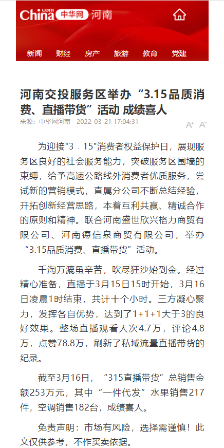 2022年3月21日,中華網、中原網以題為《河南交投服務區舉辦“3.15品質消費、直播帶貨”活動成績喜人》對服務區公司直屬分公司直播帶貨活動進行報道。網址:中華網:https://henan.china.com/m/rdzx/2022/0321/2530262114.html中原網:https://m.zynews.cn/eyes/2022-03/21/con…