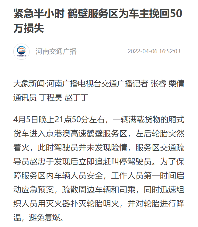 2022年4月6日,河南交通廣播以題為《緊急半小時 鶴壁服務區為車主挽回50萬損失》對公司鶴壁服務區緊急救援進行了報道。網址:https://share.hntv.tv/news/0/1511627786119249921截圖: