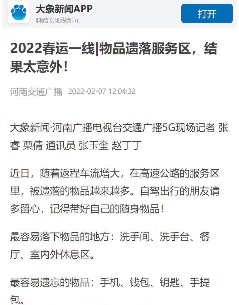 2月7日,“河南交通廣播”、今日頭條、“河南交通廣播”新浪微博官方號等媒體以“2022春運一線|物品遺落服務區,結果太意外!”為題,對公司所屬服務區春節期間溫馨服務進行宣傳報道。點擊原文:https://share.hntv.tv/news/0/1490536932762804226https://www.toutiao.com/i70…