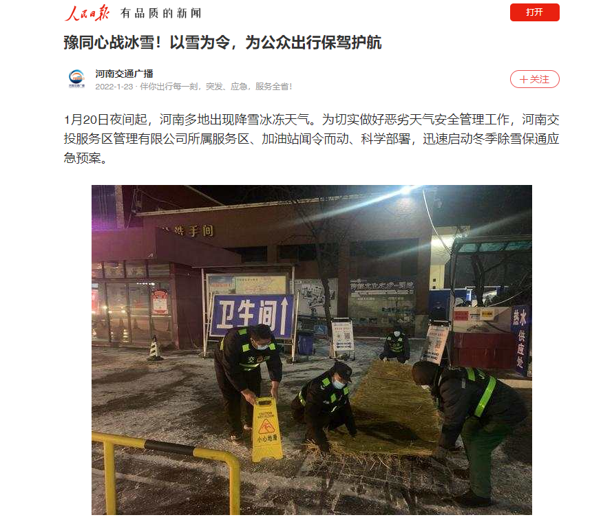 2022年1月22日,人民日報以題為《豫同心戰冰雪!以雪為令,為公眾出行保駕護航》對公司所屬服務區全力應對極端天氣,為司乘人員出行保駕護航進行了報道。網址:https://wap.peopleapp.com/article/rmh26186441/rmh26186441截圖: