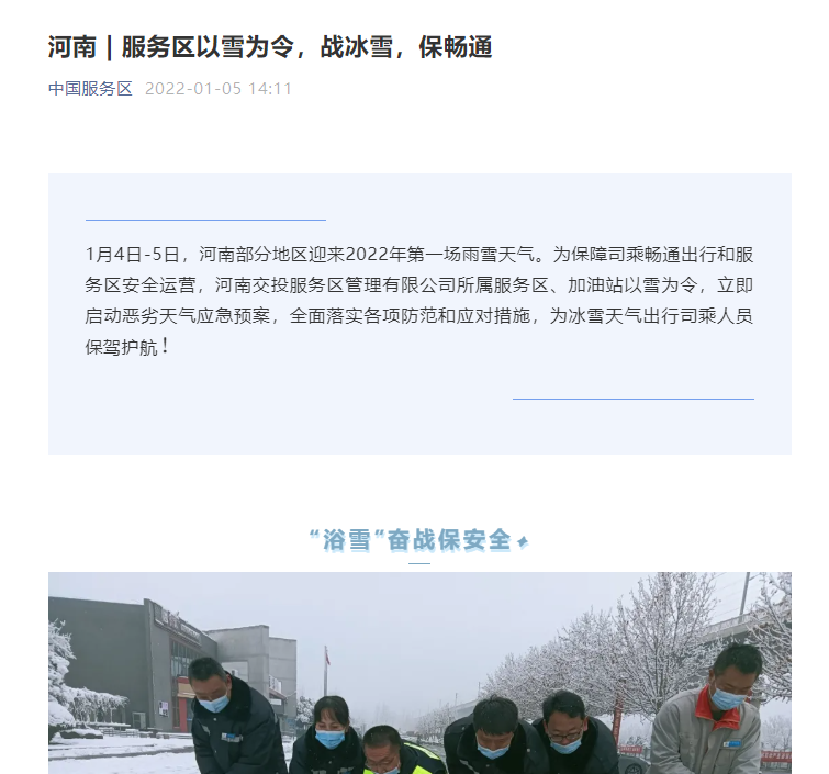 來源: 本站 發(fā)布時(shí)間: 2022-01-052022年1月4日-5日,中國服務(wù)區(qū)以題為《河南 | 服務(wù)區(qū)以雪為令,戰(zhàn)冰雪,保暢通》對(duì)公司所屬各服務(wù)區(qū)、加油站各項(xiàng)防范和應(yīng)對(duì)措施進(jìn)行了報(bào)道。網(wǎng)址:https://mp.weixin.qq.com/s/LXAyhUfpObTpC4HRB_vzJA截圖: