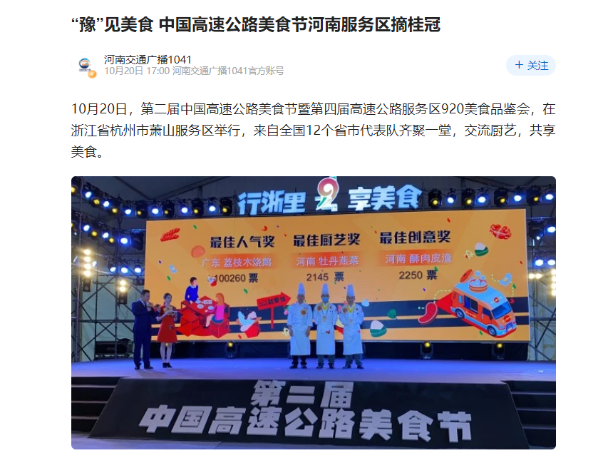人民日報、大象新聞、河南交通廣播、今日頭條:“豫”見美食 中國高速公路美食節(jié)河南服務區(qū)摘桂冠