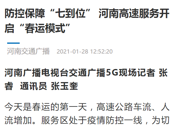 1月28日,河南交通廣播以題為《防控保障“七到位” 河南高速服務開啟“春運模式”》對公司春運安全保通、疫情防控、優質服務進行了報道。網址:https://www.hntv.tv/daxiangkuplpd/article/1/1354653511450759168?t=c54423e01e53a9911bb2c1202d7319a7&source=mobile