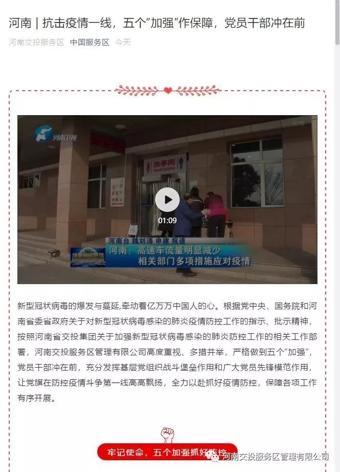 2月7日,中國服務區以題為《河南|抗擊疫情一線,五個“加強”作保障,黨員干部沖在前》對公司疫情防控工作進行了報道。