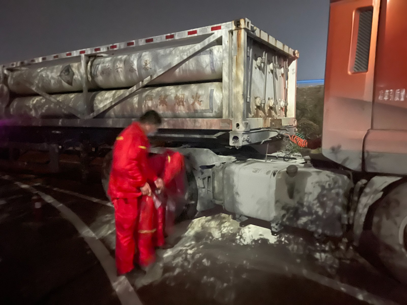 2021-12-25 作者:12月24日晚,信陽(yáng)服務(wù)區(qū)值班人員發(fā)現(xiàn)一輛危化品車停在入口廣場(chǎng)附近,輪胎起火,形式危急。服務(wù)區(qū)立即啟動(dòng)應(yīng)急預(yù)案,聯(lián)系就近加氣站工作人員,攜帶滅火器實(shí)施滅火,并使用錐形標(biāo)封閉事故區(qū)域,在來(lái)車方向擺放三角架、錐形標(biāo),爆閃警示燈,警示過(guò)往車輛,短短五分鐘內(nèi),車輛著火…