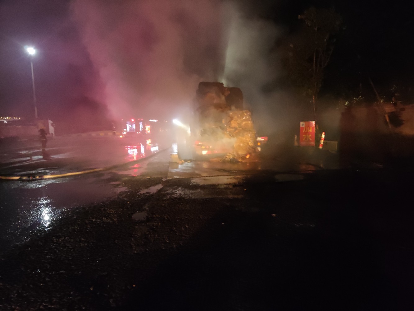 由于紙箱屬于易燃物,明火被撲滅后又因風力很快復燃,在連續噴射40多個滅火器后,工作人員打開消防栓,接上水龍帶進行撲救,有效控制了火勢的蔓延。隨后,消防車及時抵達現場,在服務區的配合下火勢得以被控制。為防止復燃和其他次生災害發生,工作人員持續開展澆水冷卻等后續工作。此次事故是由于輪胎高溫引燃所載紙箱引發火災,駕駛員激動地說:“幸虧正好經過服務區,再晚一點車就完了,60多萬呢!謝謝你們!”此次突發事件的成功處置,得益于服務區常態化開展應急消防演練,關鍵時刻人人都是“消防戰士”,能夠有條不紊、安全高效地處置火情,為公眾安全出行保駕護航。